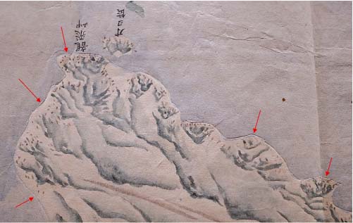 これまで白径は下図作製の基準線や、交会線などで使用されるものと説明されてきたが、不測量の竜飛岬周辺の海岸線や、同じく不測量であった十三潟の東側の湖岸を示すように白径が引かれ、陸地や海が着色されている。測線については針突法で複製できるが、測量されていないため針穴のない海岸や湖岸はどのように複製作図したのであろうか。