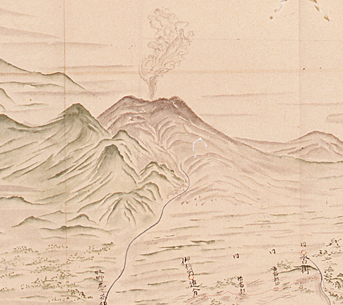 国宝:地図・絵図類57「越後街道図第四〈自安中/至上田〉」から浅間山 伊能忠敬記念館所蔵 無断流用禁止