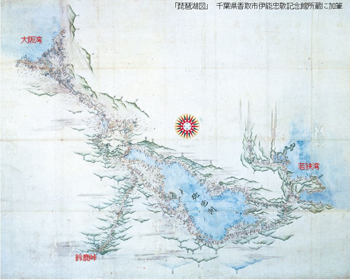 今回の展示では、特別地域図の琵琶湖図と滋賀県~福井県を描いた大図が展示されています。下の「琵琶湖図」を見ていると何か変です。それは、この地図が西を上にして軸装されて釣下げられているため、敦賀や三方五湖が右側に、大阪湾が左上に、鈴鹿峠が左下にあるのです。「地図では北が上」ということが刷り込まれている身には混乱をきたします。