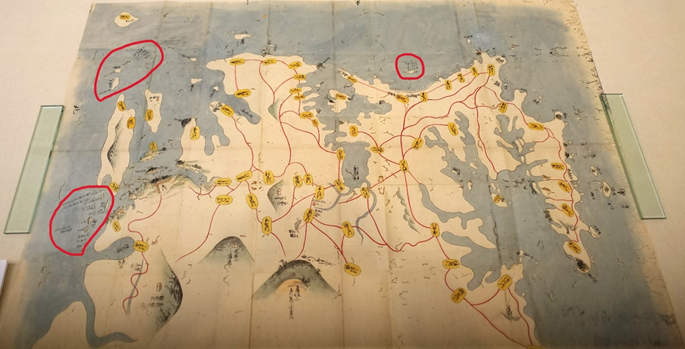 千葉県香取市佐原の伊能忠敬記念館では第111回収蔵品展が始まりました。今回の展示では、忠敬が地図作製のために集めた参考絵図の展示が注目されます。参考絵図は幕府が主要大名に作らせた一国単位の国絵図の写しから村が提出した村絵図まで含まれ多様で多彩です。今回は国絵図や郡絵図に焦点を当てて展示されています。下に掲載した『志摩国全図』は紺野浩幸「伊能忠敬と国絵図」(『国絵図読解事典』2021年)によると、国絵図の写しに忠敬が地名や距離を書き加えているとのことです。赤く囲った部分が忠敬加筆箇所です。なお、光量をおとした第2展示室内の展示ケース越しに撮影しているため、照明や撮影者の影が映り込む事もありますがご寛恕願います。展示の概要は展示品リストをご覧下さい。
